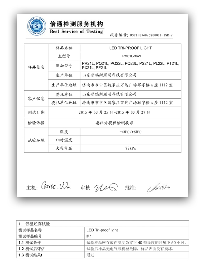 冷庫燈低溫檢測報告: