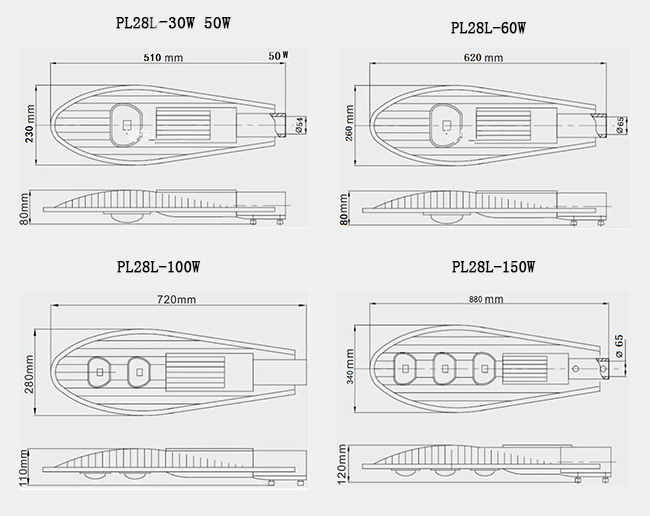 型號 | PL28L-30W | PL28L-50W | PL28L-60W | PL28L-100W | PL28L-150W |