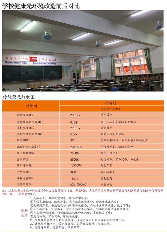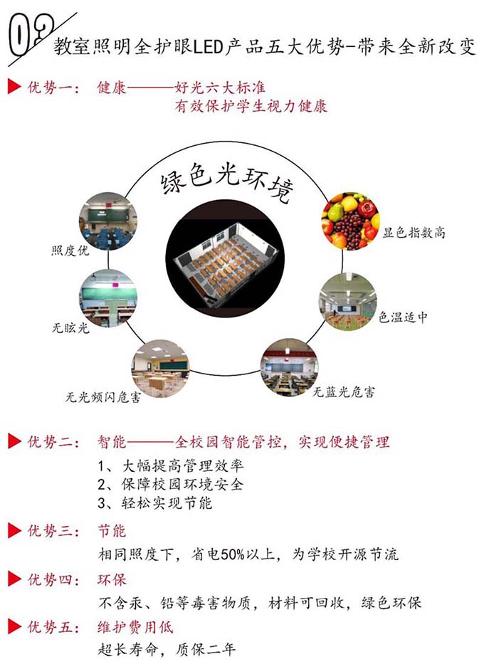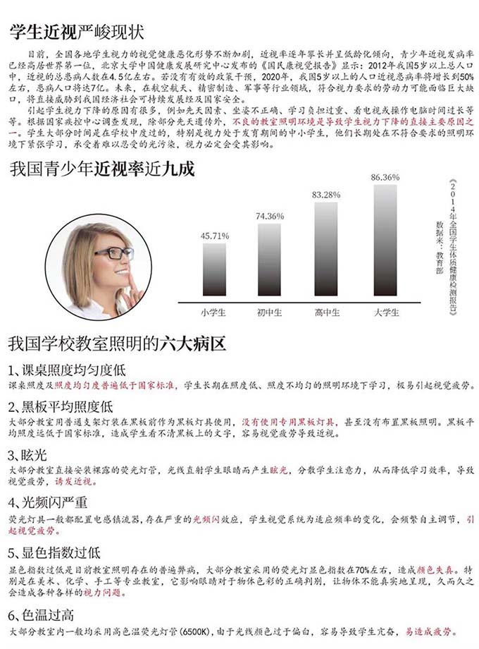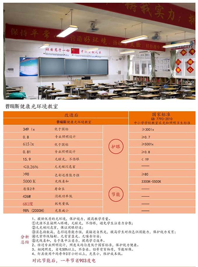 教室燈的燈光顏色更加真實,不刺眼,學(xué)生眼睛很舒適,疲勞度低,不會因為眼睛疲勞而產(chǎn)生厭學(xué)心理,降低近視率。