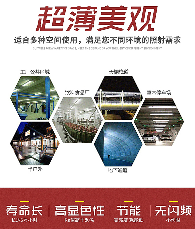 工廠車間、辦公室、食品廠、冷庫、商場、超市、紡織廠、防腐等場所的照明,可完全替代傳統(tǒng)三防燈具。