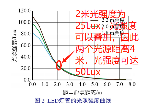 LED 燈 管 (18 W、2 100 lm、 6 500 K) 作為單光源對分娩舍內(nèi)的光源進行 布置。LED 燈管的光照強度曲線如圖 2。分娩 舍所需的光照強度為 50 Lux ~ 100 Lux。從 圖 2 查得在地面距離燈管中心水平距離 2 m 處的光照強度為 25 Lux。根據(jù)光照強度的可 疊加性,將兩燈管的水平距離設(shè)置為 4 m,則 在兩燈管水平距離中心處地面的光照強度為 50 Lux,滿足分娩舍光照強度需求。